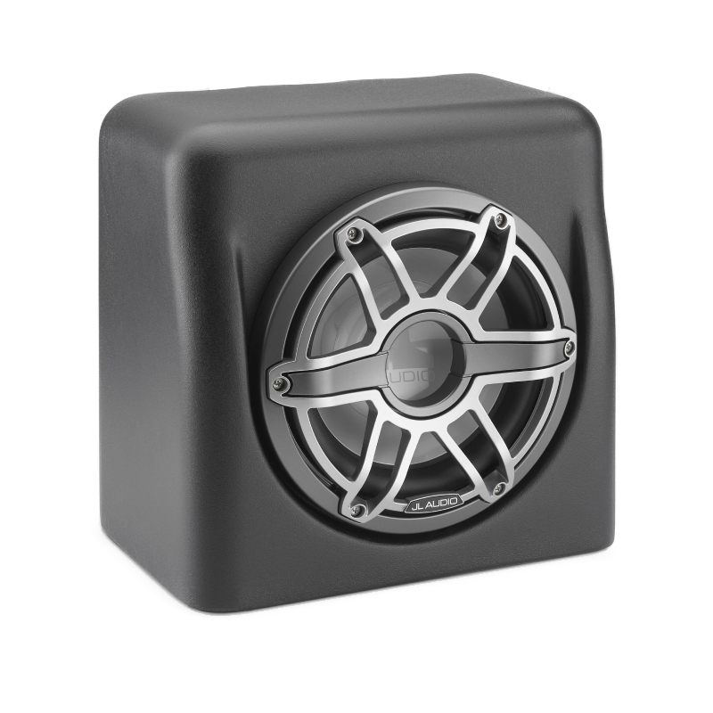 JL Audio M6-10FES-Mb-S-GmTi-4 M6 Series Single 10" 250W RMS (500W Peak Power Handling) 4 Ohms, Marine Subwoofer in a Sealed Matte Black Fiberglass Enclosure with Titanium Sport Grille