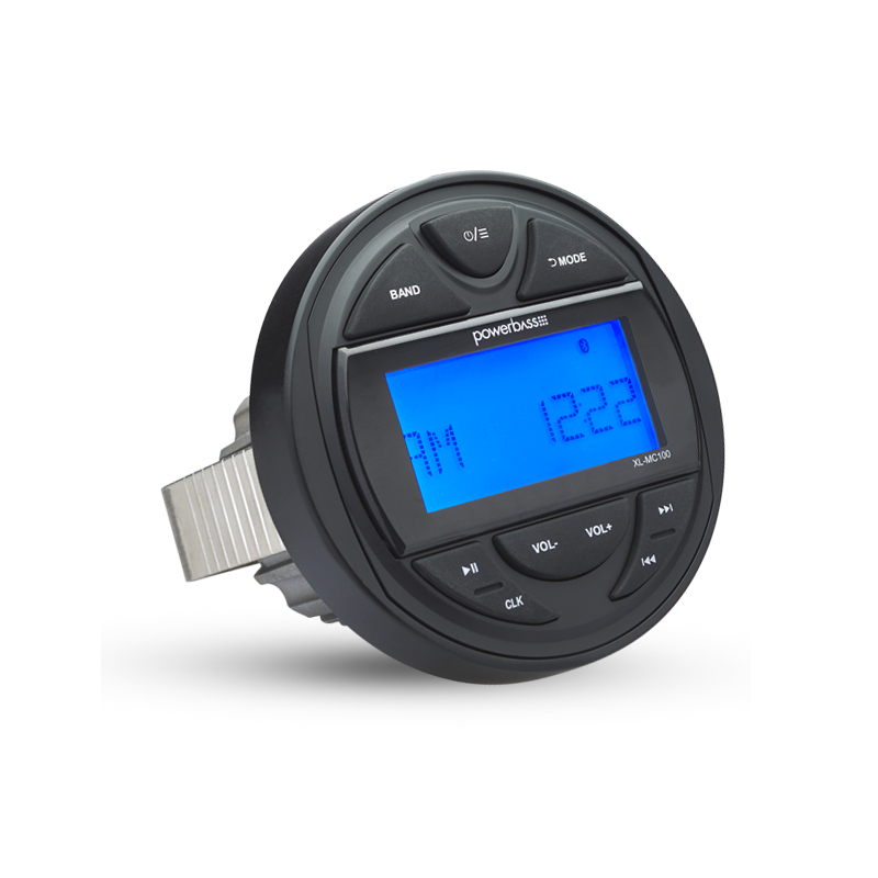 The MC100 is designed to fit in the same space as your vessel’s tachometer to integrate clean and easy into your control center while giving you the power to control your sound with large easy to push illuminated buttons. Connection to your music library is simple with the built in Bluetooth mode, AUX or USB inputs, and for users that want to hear their favorite AM / FM Station use the built in tuner that also keeps you safe on the water with preset Weather Band stations. Built to Marine Grade specs the sealed face panel and 2.75” LCD screen allows you to control not only your music but also the sound with preset equalization and tone control while providing 25W x 4 RMS from its built in amplifier to run your cabin or lower deck speaker system. With PowerBass Extreme Marine and Powersports products the sound track for your adventures comes alive!