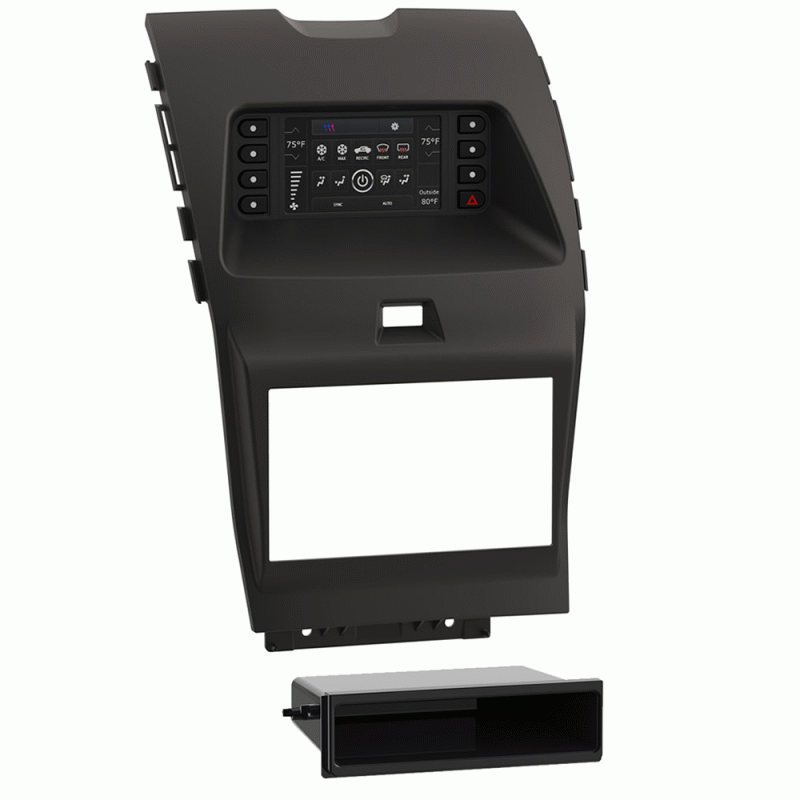 ISO DIN radio provision with pocket, ISO DDIN radio provision, Touchscreen display for climate and personalization features, Included interface for climate and steering wheel functions, Integrated hazard button and passenger airbag indicator, Painted charcoal, Provides accessory power (12-volt 10-amp), Retains R.A.P. (retained accessory power), Provides NAV outputs (parking brake, reverse, speed sense), Retains audio controls on the steering wheel, Retains SYNC (4.2-inch display screen models only), Retains the factory backup camera, Retains balance and fade (1), Micro B USB updatable.