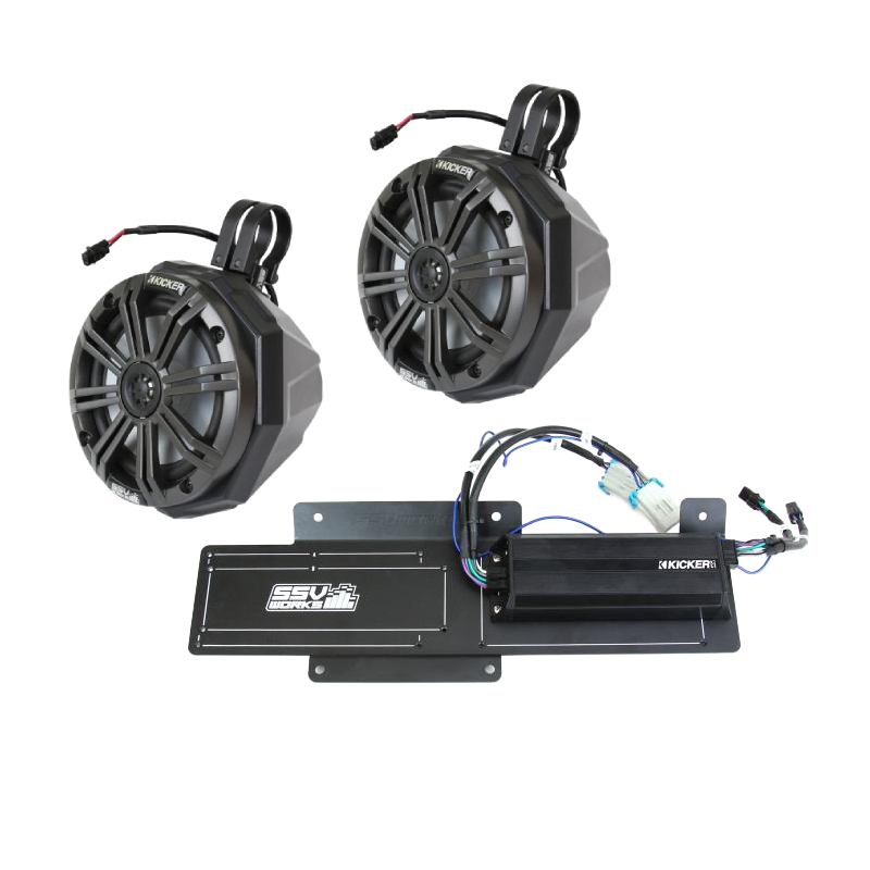 Everything in one box. No soldering, no cutting, no crimping! Simply clamp on the pre-installed speakers and pre-tuned amplifier with the included vehicle specific plug & play wiring harness. This system features the best of SSV Works to bring your side X side the cleanest, loudest and most powerful powersports audio system available... plus, it’s easy to install so you spend more time riding and less time wrenching.
