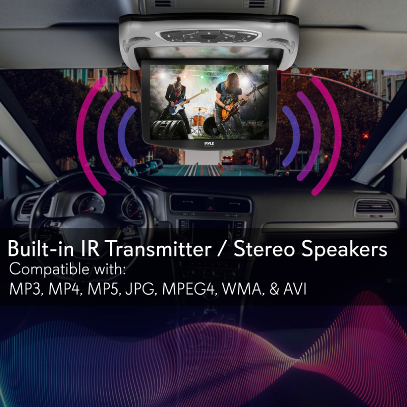 The Pyle Car Overhead Monitor with CD/DVD Player - Vehicle Flip-Down Display ScreenRoof Mount Monitor with CD/DVD Player, USB/SD Readers, FM Transmitter, Includes (3) Housing Color Covers (13.3’’ -inch Display) - Universal Vehicle Mount Overhead Display - Car Audio & Video Entertainment System - Convenient Flip-Down Widescreen Access - Overhead Console with Dual LED Dome Lights - Side Panel Slot-Load CD/DVD Player - Built-in Stereo Speakers - Top Panel Touch Button Control Center - Integrated Wired Power & Audio/Video Harness - Connection Interface: HDMI, RCA (Audio/Video), AV, FM Radio - USB Flash & SD Memory Card Readers - Wireless FM Transmitter - On Screen Menu Control - Anti-Skip Mechanism & Last Position Memory - Includes Interchangeable Multi-Color Housing Covers - *Compatible with IR Transmitter Wireless Headphones, Not Included - Flip-Down Monitor Assembly - (3) Interchangeable Housing Covers - Remote Control Technical Specifications: - Display Type: 13.3’’ -inch TFT-LCD Monitor - Housing Cover Colors: Grey, Black, Tan - Screen Resolution: 1280 x 800 Pixels - Aspect Ratio: 4:3, 16:9 - Brightness: 450 Cd/Sq.M - Contrast Ratio: 500:1 - Video System: NTSC/PAL, Auto Switch - Maximum USB/SD Card Size: 32GB - CD/DVD Player Support: DVD/VCD/MP3/JPG/MP4/CD-R/CD-RW.