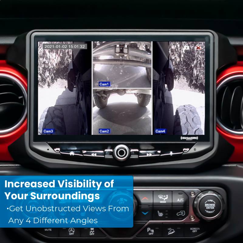 Get an amazing view of the terrain around your Jeep. Rock Crawler, or Overlander, and capture it on DVR with TerrainView from Echomaster! Add 4 cameras to any vehicle with a single video input. View 1, 2, 3 or all 4 cameras at once on your existing display.