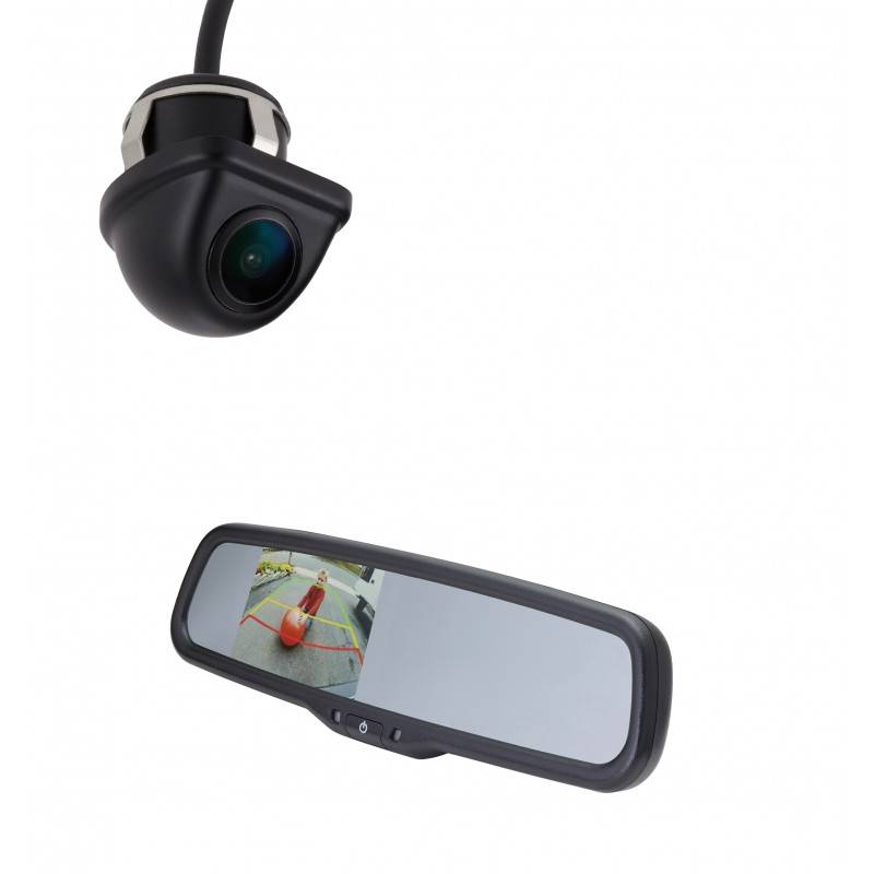 The PCAM-201 lip mount camera, and a rearview mirror replacement PMM-35-PL. Place your car in reverse and instantly you will have visibility into what's behind you, the camera's view being delivered directly on your rearview mirror on a 3.5" crystal clear monitor. With dual video inputs you can also feed an additional camera into the rearview mirror.