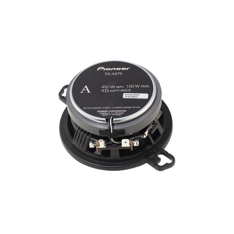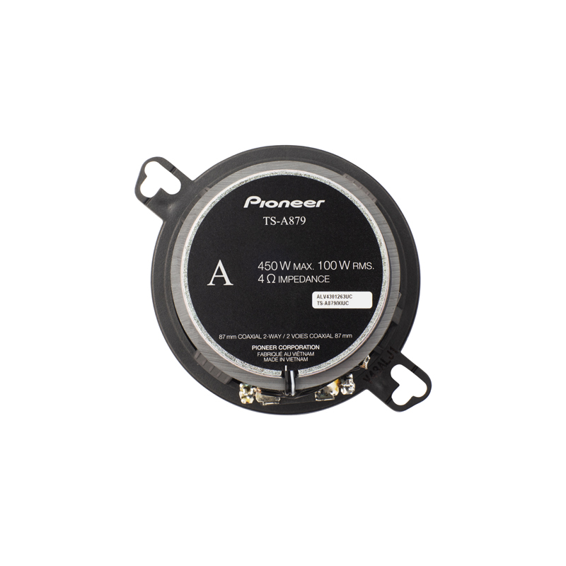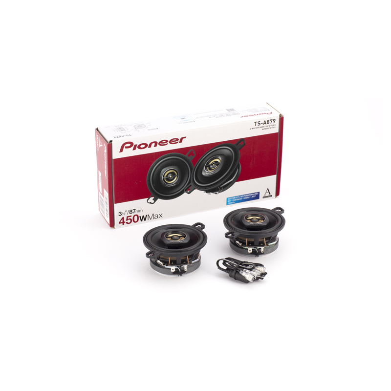 The TS-A879 is a 2-way coaxial 3-1/2" speaker. Its carbon and mica reinforced woofer cone stands up to the harsh in-car environment while providing natural sounding tonal qualities with an OPEN & SMOOTH transition to the polyetherimide Tweeter.