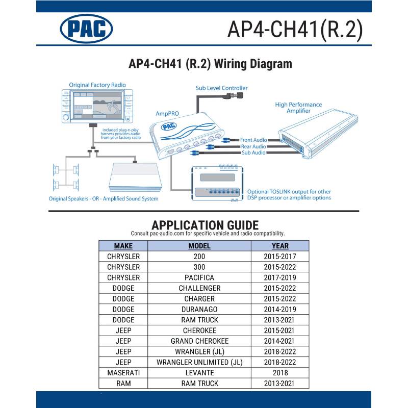 It can be used to upgrade the entire sound system or just part of it thanks to the retention of the original amplifier, Enables the addition of a subwoofer to an amplified sound system, Variable volume, fade, balance, bass, mid and treble audio settings Front, rear, sub preamp outputs (5 volt RMS) Customized OE bass, mid and treble center frequency selection, Retains uConnect, Bluetooth audio, Navigation prompts, and all warning chimes, Plug-n-Play installation Sublevel controller and Optional TOSLINK optical output (APA-TOS1 sold separately).