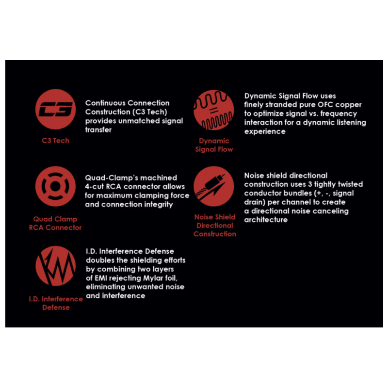 • Quad Clamp RCA Connectors: Quad-Clamp’s machined 4-cut RCA connector allows for maximum clamping force and connection integrity.