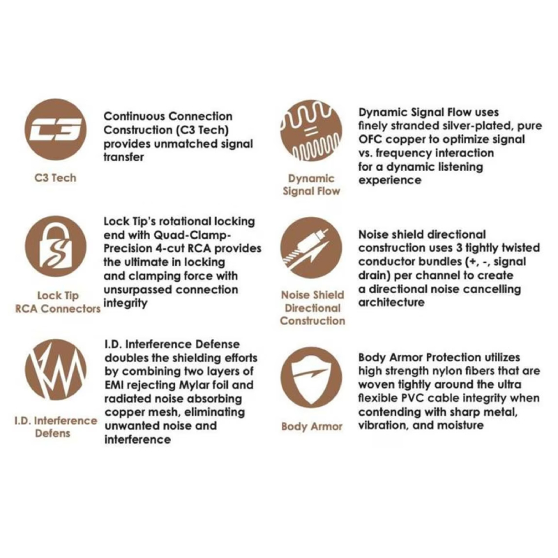 • Lock Tip RCA Interconnectors: Lock Tip’s rotational locking end with Quad-Clamp-Precision 4-cut RCA provides the ultimate in locking and clamping force with unsurpassed connection integrity.