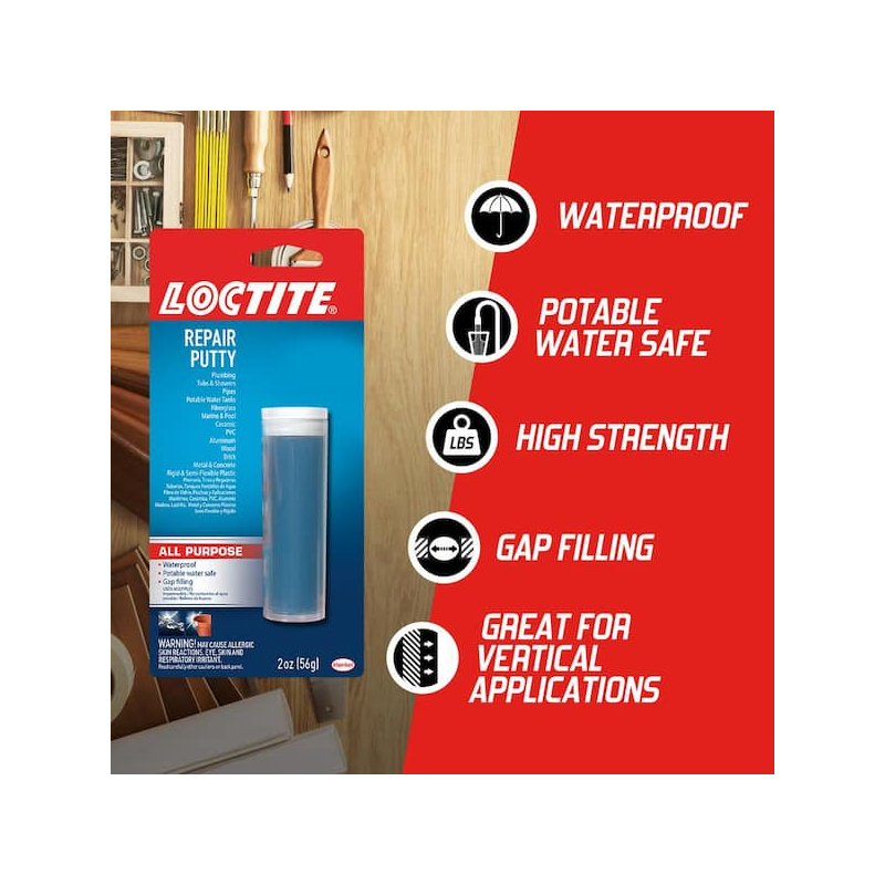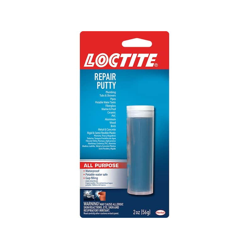 Hand-mixable and fast-setting two-part adhesive consisting of an epoxy resin putty and a hardener putty perfect for small or emergency repairs. Ideal for sealing pipes, fixing leaks in tanks and drains, and repairing appliances, tools, furniture, toys, automotive parts, pools and cracks in concrete, this versatile putty bonds to metal, masonry, brick, wood, glass, ceramic, rubber, fiberglass composite, china, stone, marble and many rigid plastics.