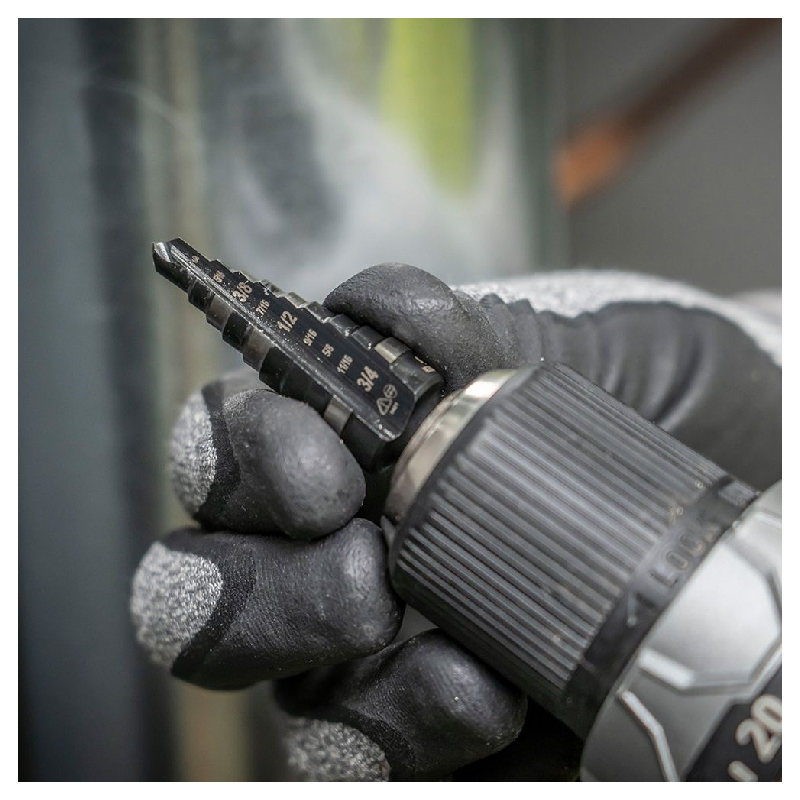These Double-Fluted Step Drill Bits provide faster cutting and drilling than single flute bits. The easy-to-read step markings and targets save time when drilling holes. Thick 3/8-Inch hex shank provides a firm, positive grip and won't spin out in the drill.