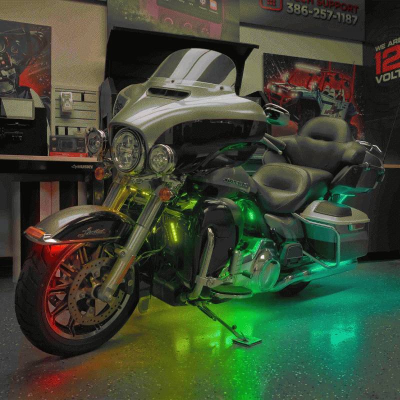 Water-tight, labeled connectors to make installation an ease, RGB Strips Rated IP68 to withstand the elements, Controller Rated IP67, 5050 RGB LED strips with VHB adhesive backing, Lights controlled via a smart device app, Pre-wired trigger control for brake lights to add extra visibility for riders, Pre-wired LED strips for triple tree, front fender, down tubes, gas tank, back engine, lower frame, saddlebags, and Tour Pak®, RGB controller included, 1-year warranty on LED strips and RGB controller and Installation level: Moderate.
