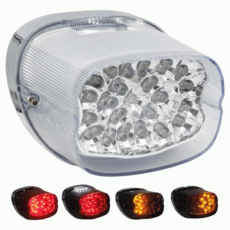Fits Harley Davidson® 1999-2016, LED replacement tail light with turn signals, Bright, fast acting LEDs, Brake light, running light, turn signal, Red brake and running, yellow turn, and Replaces stock rear tail lamp.