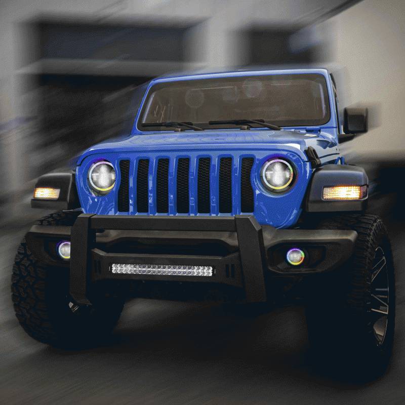 The headlights have an output of 4200 lumens for the high beam and 3200 lumens for the low beam. The durable polycarbonate lens cover makes this an ideal solution for adventurous Jeep® owners. This kit offers more than 170 pre-programmed modes for patterns with 16 million different colors.