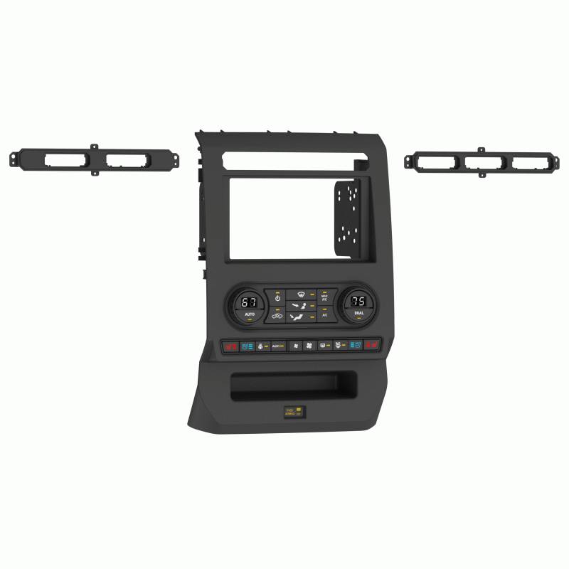Stereo installation kit designed to fit any standard 2” or 4” tall aftermarket radio, Designed for models with a factory 8” screen, Factory-style hard buttons with laser-etched graphics to retain and control most climate functions that are normally lost when removing the factory radio, and Easy-to-use rotary knobs with LCD, displays status for temperature and fan speed.