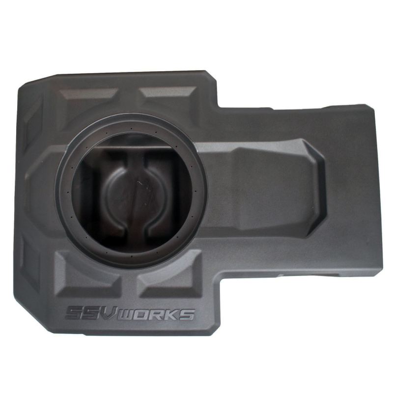 SSV Works custom molded sub enclosure is designed for a 10" subwoofer and easily installs behind the passenger seat. NO CUTTING REQUIRED, the box simply bolts in and provides the proper airspace required for a 10" sub.