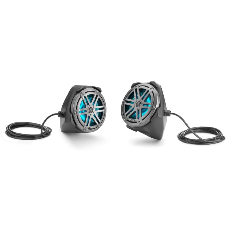 The Hard Data: Contains one pair of M3-650X-S-Gm-i coaxial speakers with RGB LED illumination, each in a sealed, fiberglass enclosure. 60 watt power handling (per channel). Installs into side cockpit structures. 4 ohms per channel.