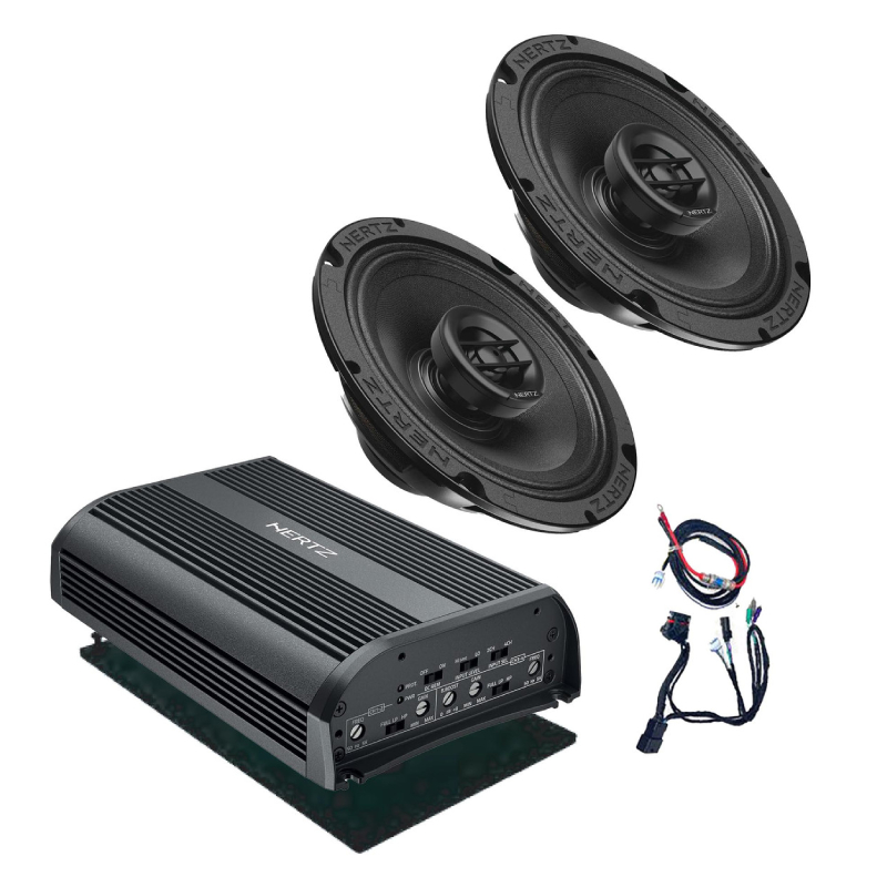 Hertz HSP1-14 Plug and Play Front Speaker Kit for 2014-2023 Harley Davidson Street Glide and Road Glide Motorcycles - Includes: SP4.900 amplifier, H D14DMAP amp mounting bracket, SX 165 NEO Coax Speakers and HTHP14 T-Power Harness and both Street Glide & Road Glide speaker grilles