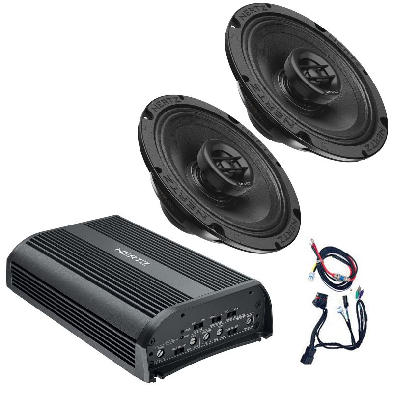 Elevate your ride with the Hertz SX-165-NEO 6.5" two-way coaxial speakers, featuring neodymium magnets and UV/waterproofing for unbeatable clarity. The HD14DMAP amplifier mounting bracket ensures a secure, clean installation, while the Hertz HTHP14 T-Power Harness makes setup a breeze with easy plug & play installation.