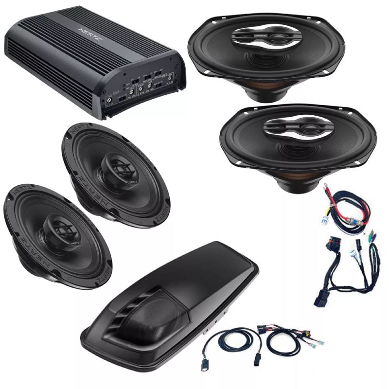 Hertz HSP3-14 Plug and Play 4-Speaker Kit with Saddlebag 6"x9" Kit for 2014-2023 Harley Davidson Street Glide and Road Glide Motorcycles - Includes: SP4.900 amplifier, HD14DMAP amplifier mounting bracket, SX165 NEO Coax Speakers, SX690 NEO.1 Coax Speakers, HTHP14 T-Power Harness, HD14H Saddlebag Lid Kit with Speaker Harness and both Street Glide & Road Glide speaker grilles