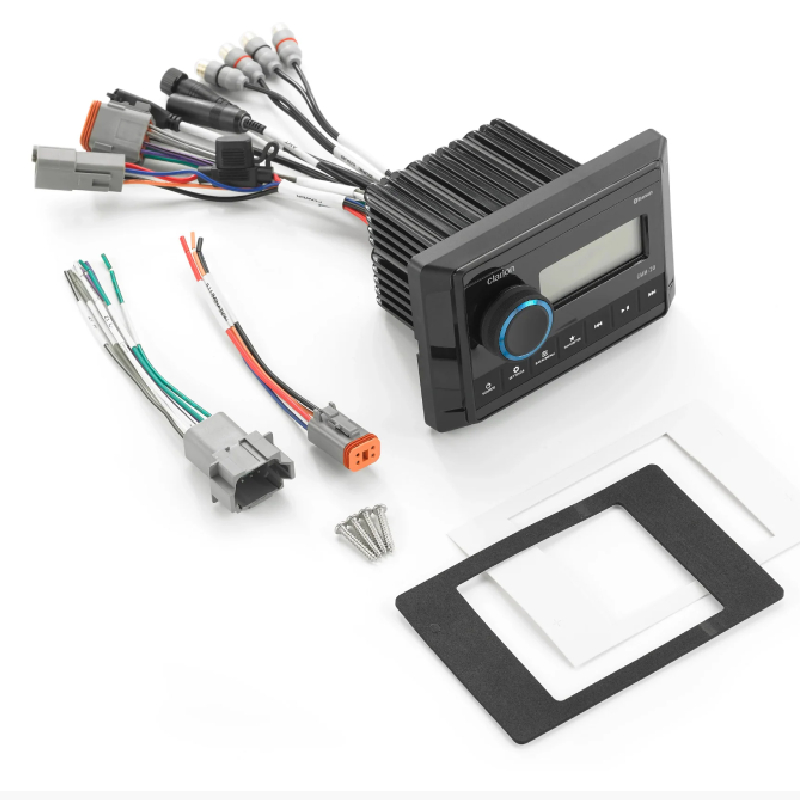 The CMM-20 digital media receiver offers versatile support for digital audio sources, including Bluetooth connectivity for wireless music streaming from smartphones and other devices, as well as USB ports and auxiliary inputs for playing music from external sources. Its high-contrast display ensures readability in various lighting conditions, displaying song details and settings clearly. Additionally, it includes an AM/FM tuner with preset station memory for convenient access to your favorite radio stations during water activities.
