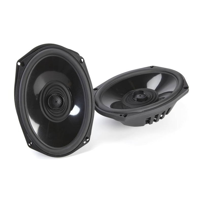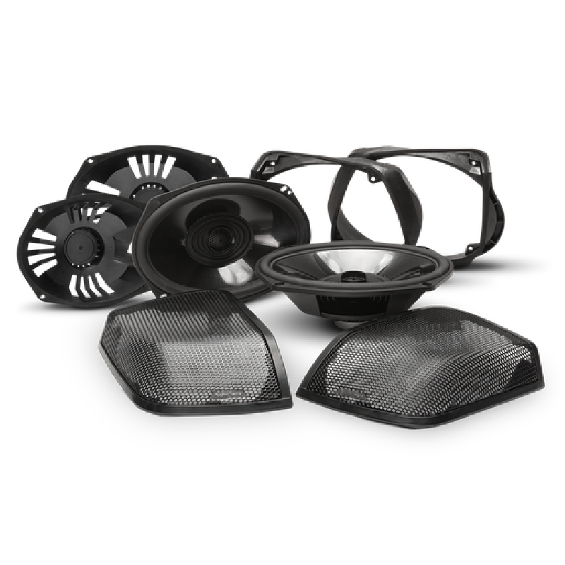 This powerful package includes two rugged, road-ready Rockford Fosgate TMS69BL14 full-range 6"x9" speakers that are designed for bag lid applications. These weather-resistant speakers feature a neodymium motor structure, reinforced polypropylene cones with durable Santoprene surrounds, plus 1" dome tweeters. They pack a lot of sonic punch into a rugged, road-ready design that'll provide a big boost to your bike's audio quality. The included speaker installation kit includes a cutting template, waterproof bag lid mounts, and speaker grilles speakers.