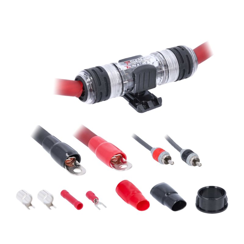 • 1/0 AWG spade terminals with silver and black boots for amp connection