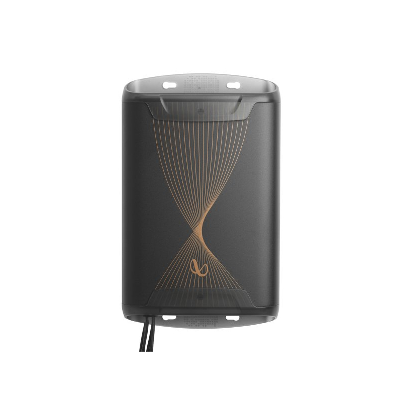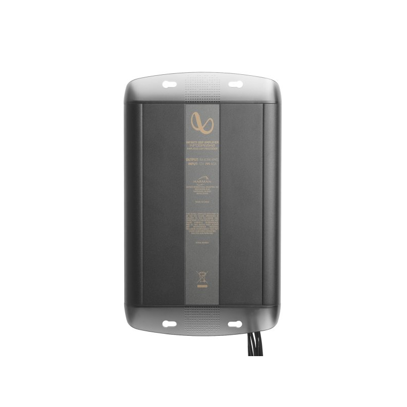 Sleek Industrial Design: The amplifier's modern design, featuring a smooth curve, angular end cap, and the iconic Infinity logo, blends style with functionality, making it an attractive addition to any setup.
