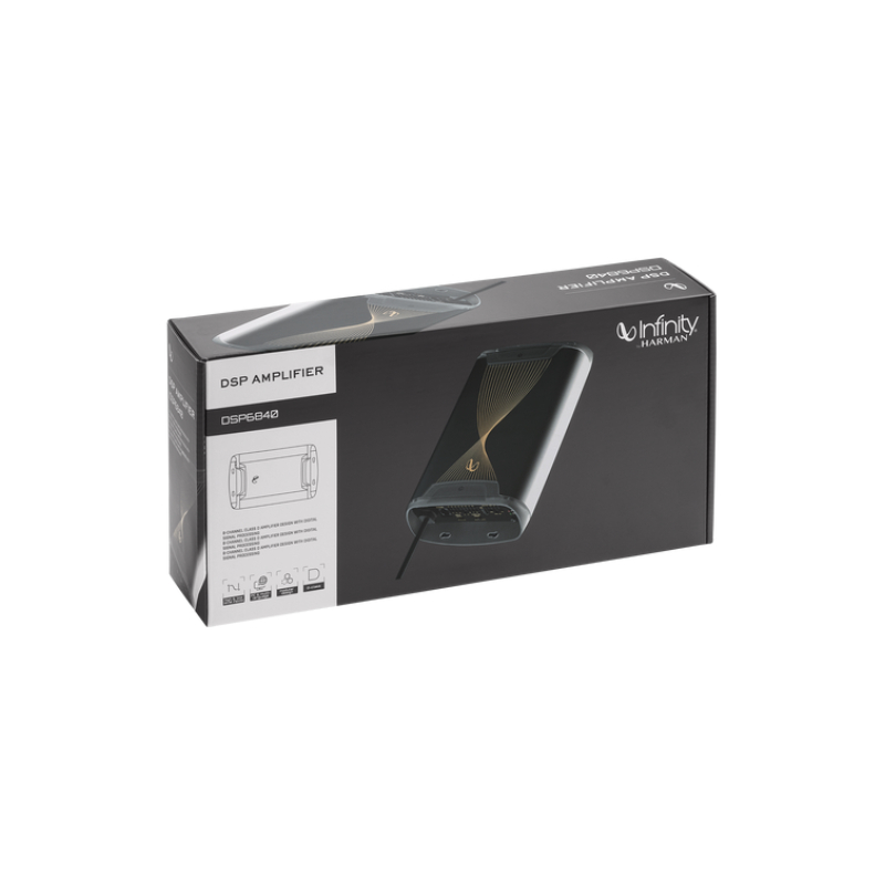 The Infinity INFDSP6840 is an 8-channel Class D amplifier, offering 480 watts of power. It has a 2-ohm stable design, LED Power/Protect light, and a wired bass level remote control for easy customization. With signal sensing remote turn-on and speaker-level inputs, it's perfect for enhancing your car audio system.