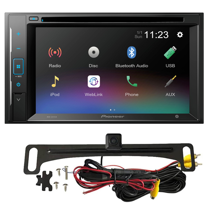 Pioneer AVH-241EX-Bundle6 includes Pioneer AVH-241EX 6.2" 2-DIN WVGA Resistive Clear type Touch Panel DVD Receiver + Voxx ACAM4 Wide Angle License Plate Mounted Backup Camera with Parking Lines