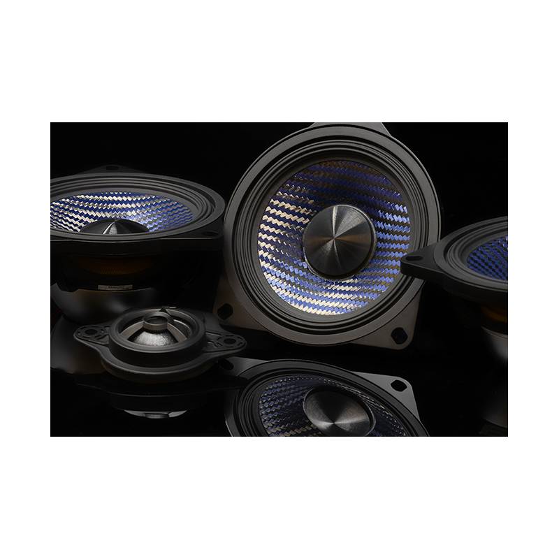 • Advanced Speaker Materials: Hybrid blue carbon fiber cones offer lightweight strength and precision