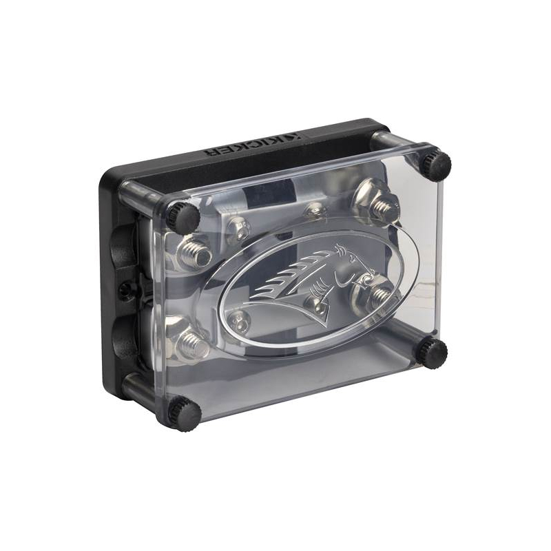 The Kicker Warhorse HPFD2 is a high-power 2-channel fused distribution block, designed with a robust and dynamic style that makes it a standout component for your power supply. This shiny brass unit features an easily removable protective cover, providing quick access to all wire and fuse connections. It safeguards up to two power lines with AFS fuses (sold separately). The transparent cover plate allows for instant visual checks of fuse status and connections. Built for competition-level performance, the HPFD2 uses screw-down binding posts for wiring terminals, requiring ring terminals for safe, secure installation, maintenance, and reliable operation. Dimensions: 4.3" x 1.8" x 3".