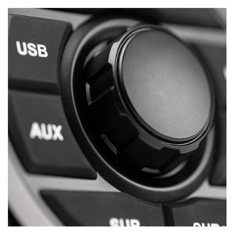• Source Unit Features: Marine Grade Protection / IPX Rating, Apple Control. Input types: BT, RCA, USB. Built-in four channels of output plus a subwoofer RCA output.