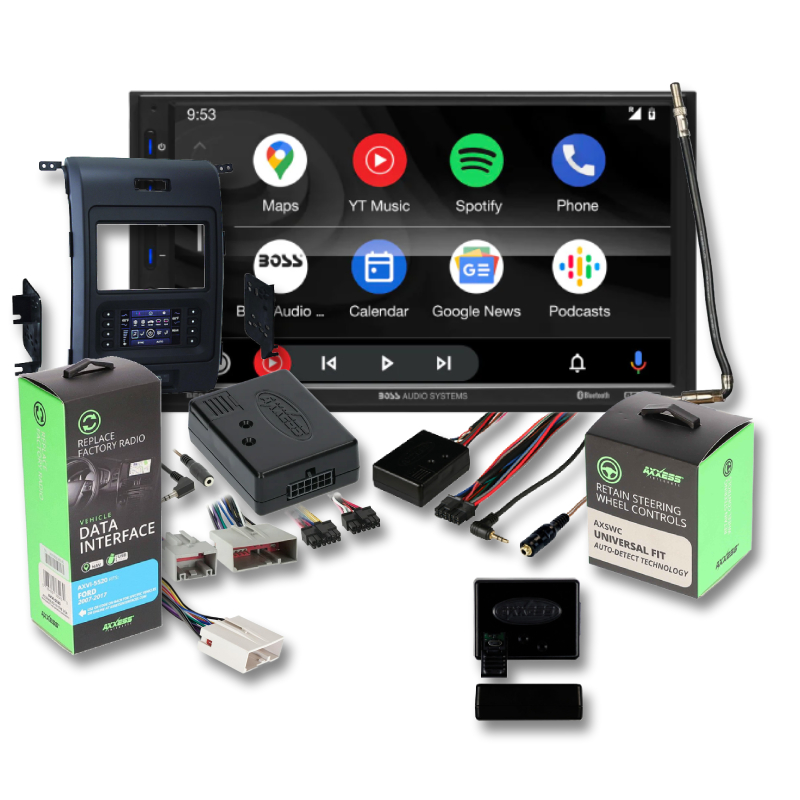 Boss Elite BE920WCPA 2-DIN 7" Digital Media Receiver + Metra Electronics 99-5846B Ford F-150 2013-2014 (With factory 4.2in screen) -TurboTouch + Metra Electronics 40-CR10 Factory Antenna to Aftermarket Radio Adapter for Chrysler/Dodge/Ford/GM 2006/Jeep 2002-Up + Metra Electronics 70-5520 OEM Deck Harness + Axxess AXVI-5520 Data Interface for Ford 2007-Up + Axxess AXSWC Universal Steering Wheel Control Interface for 2015-Present Ford Mustang with 8" Oem Screen