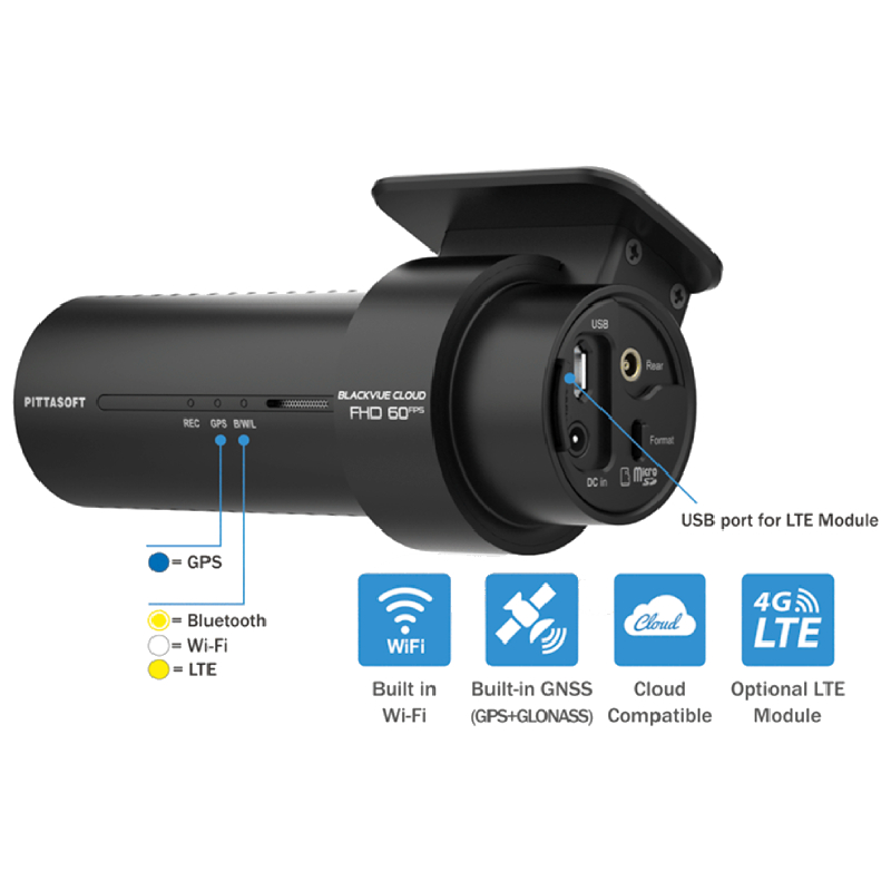 he BlackVue dashcam offers built-in GPS to track your vehicle's location and overlay speed data on video playback, with customizable settings. Its Wi-Fi connectivity allows seamless interaction with smartphones or tablets and connects to the BlackVue Cloud via any Wi-Fi hotspot. For optimal cloud access, the optional LTE module can be connected via the USB port, providing continuous connectivity without relying on a smartphone hotspot. Note that a separate SIM card is required for LTE connectivity, which is not included with the dashcam.