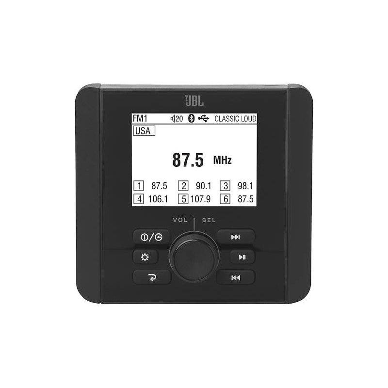 The JBL JAM3000 marine digital media receiver is built to withstand harsh marine environments. Featuring a robust aluminum chassis, front-panel protective gasket, and an IP66 waterproof face, this unit is ideal for outdoor use. It also complies with ASTM117 salt fog standards, ensuring long-lasting durability.