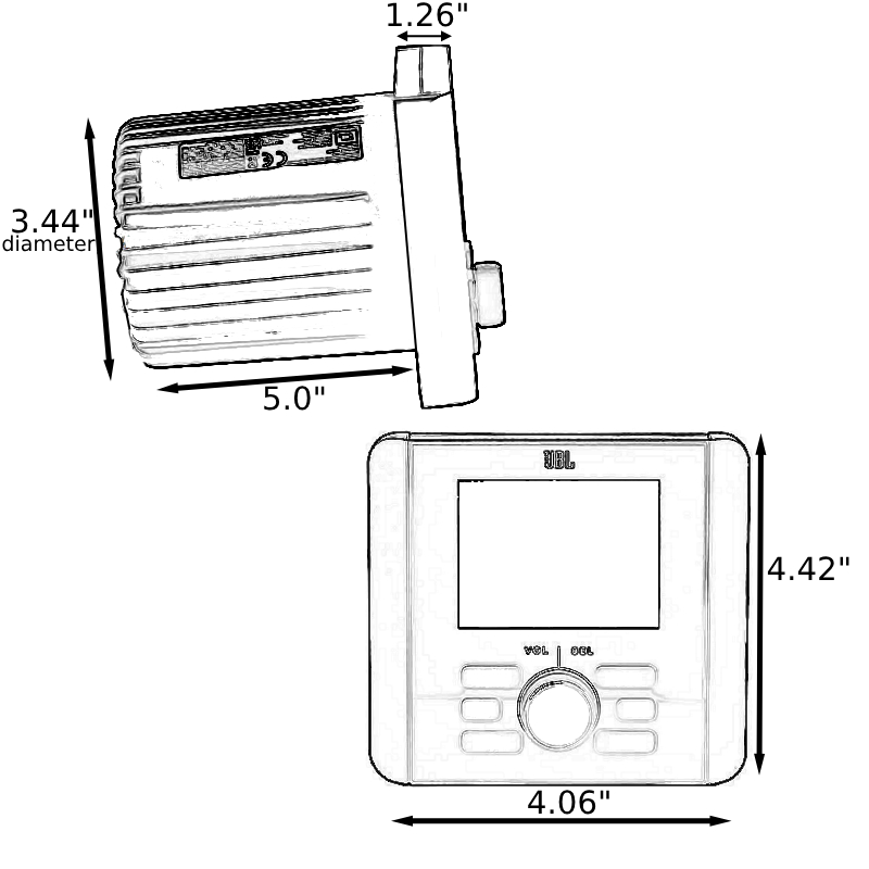 Designed with a rectangular front panel and a circular "gauge"-style chassis, the JBL JAM3000 offers flexible installation options. It requires a circular cutout in the bulkhead for the chassis. The self-adhesive foam gasket provides a tight seal, while the included U-bracket and hardware allow for secure rear mounting. Alternatively, the receiver can be front-mounted using the supplied screws.