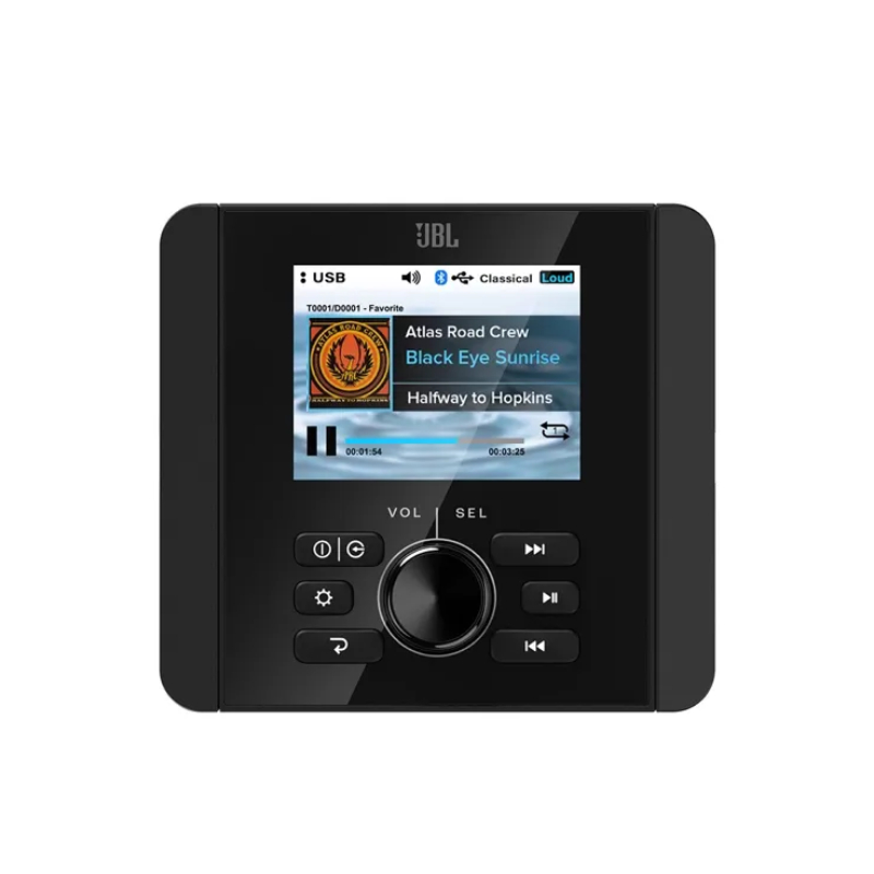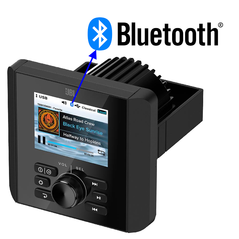 The JAM5000N incorporates built-in Bluetooth 5.3, enabling wireless audio playback (A2DP) and control (AVRCP) from Bluetooth-enabled devices. This feature allows users to stream music, audio apps, and other content from their Bluetooth-enabled smartphones or tablets to the marine digital media receiver. Basic playback functions, such as Play/Pause and Previous/Next Track, can be controlled directly from the front panel. Additionally, song, artist, and album information (excluding album art) is displayed on the front panel.