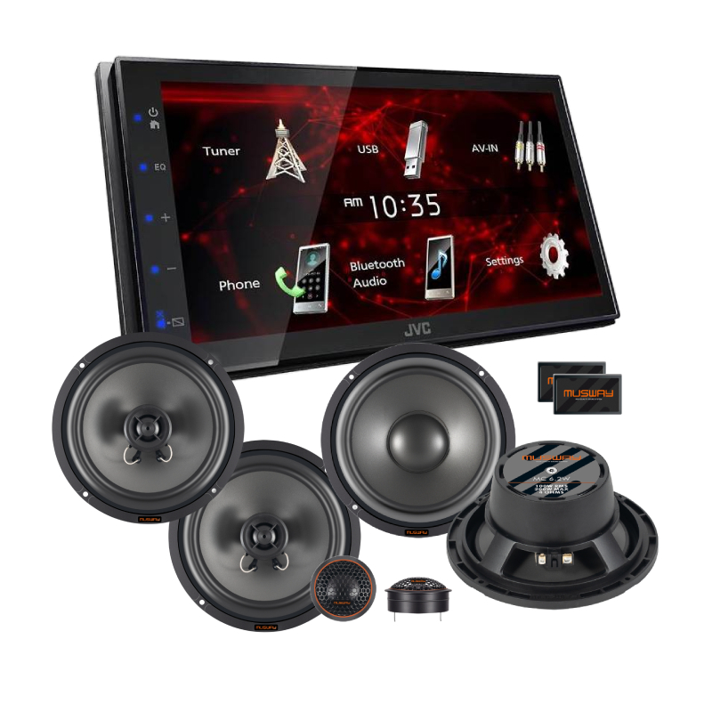 JVC KW-M180BT 6.8" Double DIN Bluetooth Digital Multimedia Receiver (does not play discs) + Musway MC62 MC Series 6.5" 200W Peak Power Handling 4 Ohms 2-way Coaxial Speakers (Pair) + Musway MC6.2C 6.5" MG Series 100W RMS 4 Ohms, Active 2-way Component System