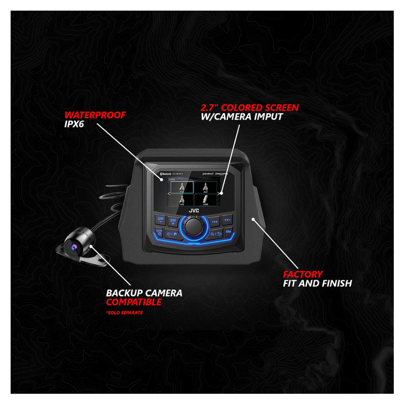 Upgrade your ride with V-Spec Kits, featuring louder speakers and larger tweeters for an unbeatable audio experience. Take control of your style with RGB Speakers & Controller, powering speakers, rock lights, and whips for the ultimate visual effect. Plus, the JVC MR3 is backup camera ready, giving you the option to enhance safety on every adventure.Built Trail Ready™, our system withstands sand, dust, water, and snow, so you can conquer any terrain without sacrificing premium sound.