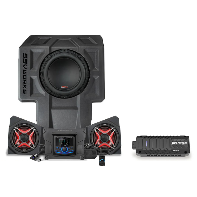 SSV Works KX-Q3V1 V-Spec 3-Speaker Plug and Play Kit (6.5” Front-Kick Pods with Speakers, 10" Subwoofer, Phase EQ Amplifier, and JVC MR3) for 2020-2024 2-Seater Kawasaki Teryx KRX1000