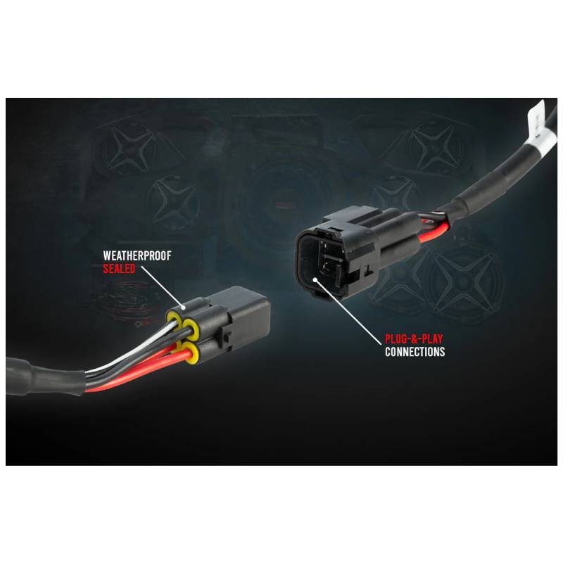 Plug-&-Play: No soldering, cutting, or crimping required! Designed for effortless installation—simply bolt down the speaker enclosures with the pre-installed speakers, connect the vehicle-specific plug-&-play wiring, turn the key, and go. Spend less time wrenching and more time riding!