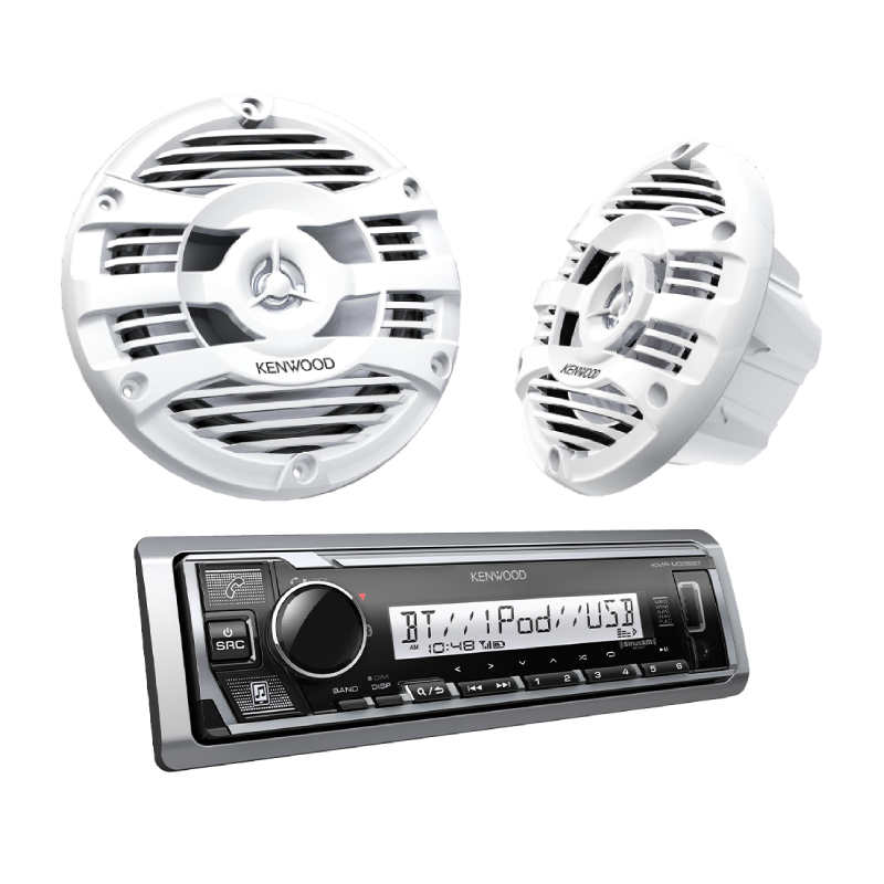 KMR-M332BT 1-DIN Marine Media Receiver, Bluetooth, Front USB and AUX, SiriusXM Ready, Conformal Coated, KENWOOD Music Mix, Remote App Ready + KFC-1653MRW KFC Series 6.5" 50W RMS (150W Peak Power Handling) 2-way White Marine Speaker