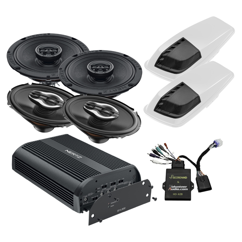 Hertz HSP3-24 A2B Base 2024 A2B 4-Speaker Kit for 2024 and Up for Harley Davidson Motorcycles (for bikes that come with Base audio package) with HD A2B Module, SP4.900 amp, SX165 NEO Coax, SX690 H 3-Way Speaker, HD24H Saddlebag Lid Kit with Speaker Harness and HHP14 Power and Ground Cable, Hog Badges for the speaker grills