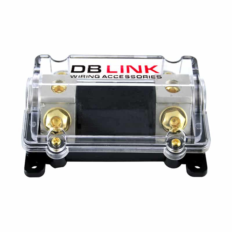 The DB Link NANLFH04X fuse holder features a durable nickel finish that resists corrosion, ensuring lasting performance in demanding environments. Built for high-current applications, it securely connects with 0 gauge input cables while maintaining a clean, professional appearance that won’t degrade over time.