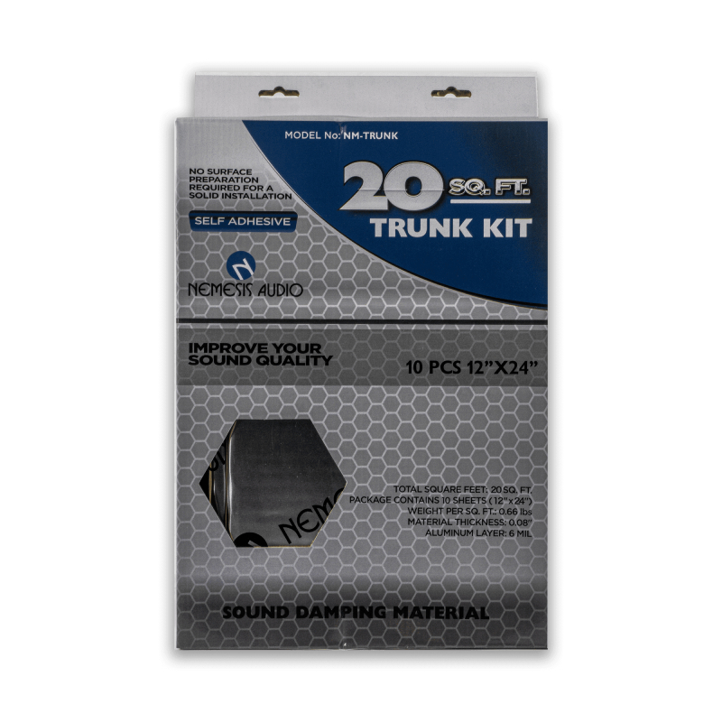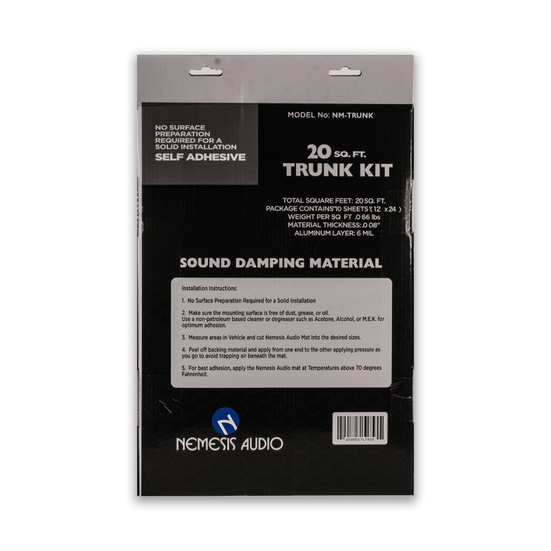 The Nemesis Audio NM-TRUNK sound damping kit is your trunk’s new best friend. With 20 square feet of dense, self-adhesive material, it tackles unwanted vibrations and road noise head-on, giving your audio system the quiet stage it deserves. Each 12" x 24" sheet features a 6 mil aluminum layer that adds stiffness and control, helping your bass hit harder and cleaner without interference from a noisy trunk.