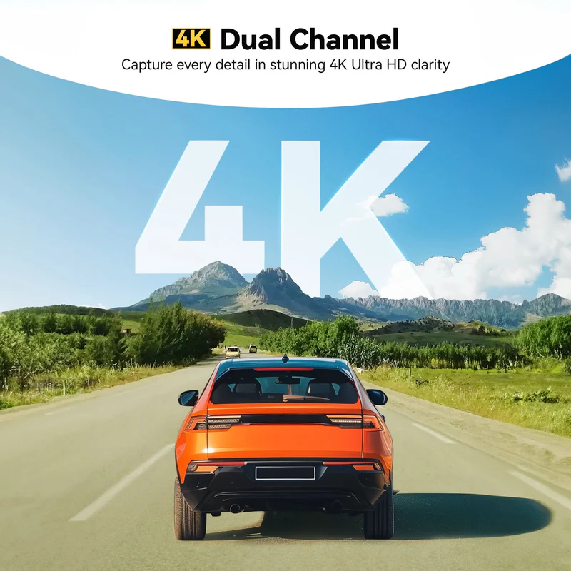 • Dual-Screen 4K + 1080P Recording: Front camera captures in 4K/30fps and rear camera in 1080P/25fps, both with HDR support for clear, detailed video.