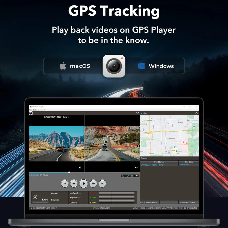 Stay informed with real-time GPS tracking, showing speed and direction while allowing playback with GPS Player for precise route details. The loop recording function ensures continuous coverage, while the built-in G-Sensor automatically locks collision footage, giving you dependable evidence when you need it most.