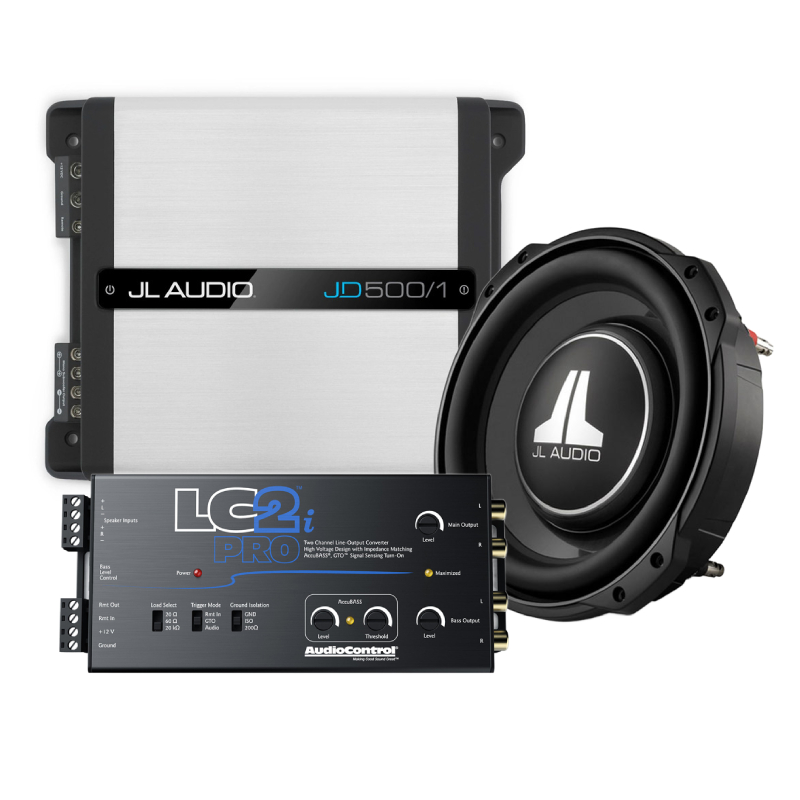 AudioControl LC2i PRO 2-Channel Line Output Converter with ACCUBASS + JL Audio JD500/1 JD Series 500W RMS x 1 at 2 Ohms, Class-D Mono Subwoofer Car Amplifier + JL Audio 10TW3-D4 TW3 Series 10" 800W Peak Power Handling 4 Ohm, Dual Voice Coil Shallow-Mount Car Subwoofer