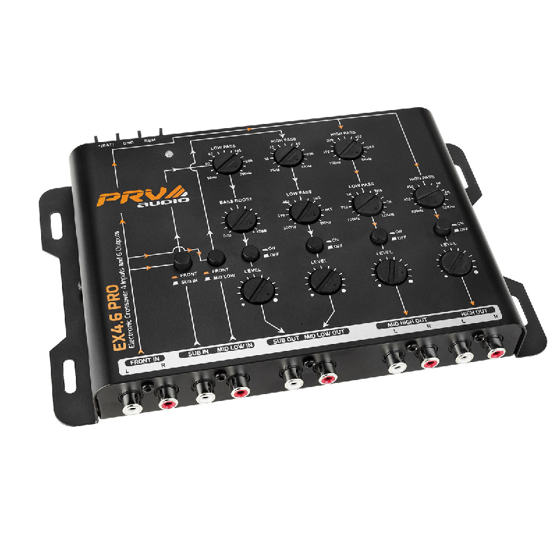 The EX4.6 PRO provides full system control with adjustable High-Pass and Low-Pass filters per channel, independent output level, and a dedicated Bass Boost to precisely tune any build. It supports 2 / 3 / 4 RCA input routing for seamless integration with factory or aftermarket sources and DSP outputs. A powerful 9-volt RMS output ensures a clean, high-strength signal to amplifiers, while the Sub Out channel includes an adjustable 0 to +12 dB boost at 45 Hz for added low-end impact.