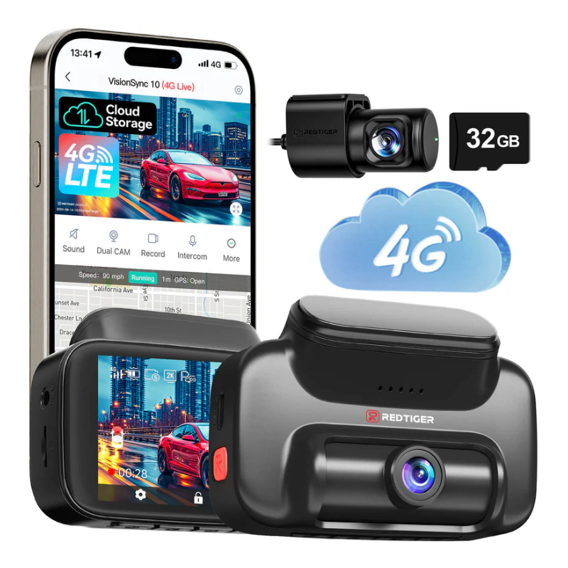 RedTiger VS10 4G LTE 2 Camera System 2.5K Front and 1080P Rear Dash Cam with Built-In WiFi, Wireless Parking Alarm, GPS Navigation, Remote Monitoring and Cloud Storage (32GB SD Card Included)