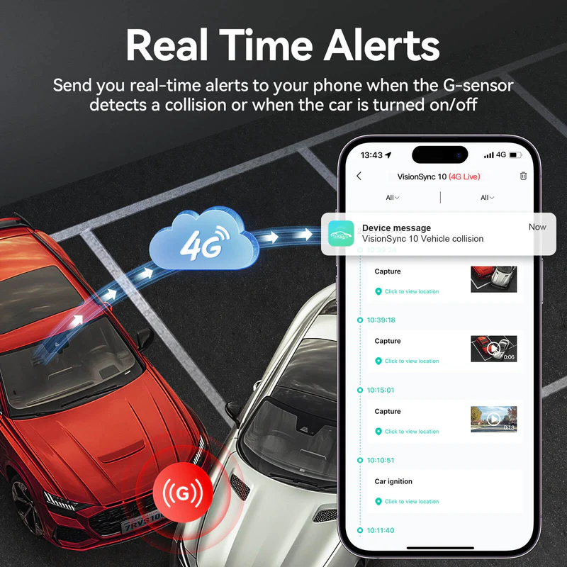 • Instant Cloud Alerts: Receive immediate collision notifications with a 15-second video clip automatically saved to the cloud